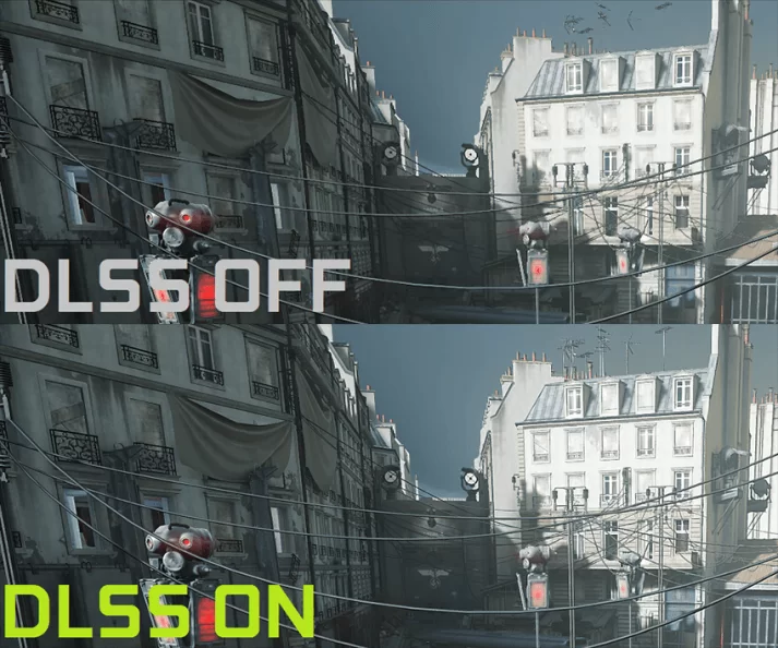 DLSS 2.0 enabled, compared to Wolfenstein: Youngblood’s highest-quality TAA mode: Pay particular attention to the Aerial's on the roof-top.